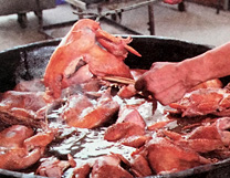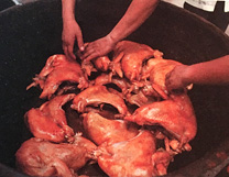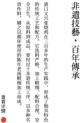 道口義興張燒雞在三百多年的生產(chǎn)實踐中,形成了獨具特色的傳統(tǒng)工藝和配方。它選料嚴(yán)格、加工精細(xì)、配料合理、安全衛(wèi)生。從原料到成品,要經(jīng)過十多道傳統(tǒng)工序,以多種名貴作料,輔之以循環(huán)使用的陳年老湯精細(xì)加工而成。因而具有造型優(yōu)美、型如元寶、豐腴完整;皮色柿紅、微帶嫩黃,色澤鮮艷晶瑩透亮;肉絲有韌勁、雞肉一咬齊茬、香味濃郁、咸淡適口;熟爛離骨,用手一抖,骨肉自行分離;無論涼熱食之,均余香滿口的風(fēng)味特色,受到各地廣大消費者的稱贊和歡迎。